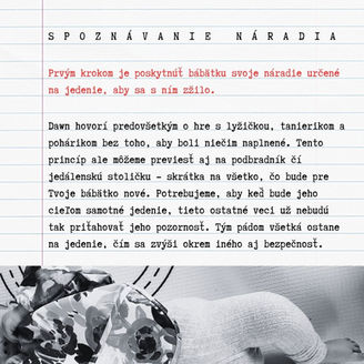Hovorte čo robíte počas dňa. "Maminka ti umýva vlasy." "Hmm táto mrkvička je dobrá." Snažte sa reč udržiavať jednoduchú. Mali by ste byť len o jeden krok pred aktuálnou vývinovou úrovňou dieťaťa - v tomto období teda udržujte vety 1-2 slovné, maximálne 3 slovné.